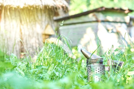 Frames of a bee hive. Beekeeper harvesting honey. The bee smoker is used to calm bees before frame removal. Beekeeper Inspecting Bee Hive