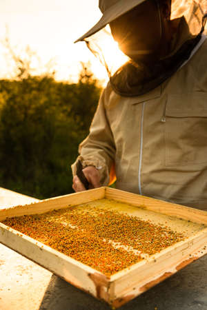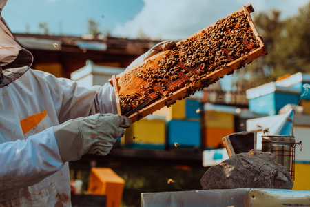 A beekeeper in protective clothing holds a frame with honeycombs, examines bees in the apiary. Preparing for the harvest of honey.