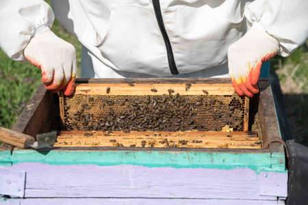 The beekeeper examines the bees with an analysis of the nest, takes out the frames and sets the size of the family.