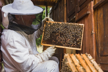 Czech beekeeper inspects the honeycomb frame in the apiary. Beekeeping is one of the oldest fields of human activity.