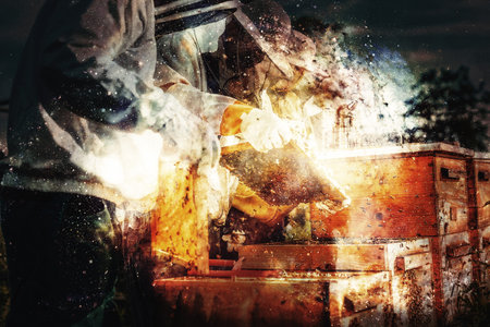 Beekeeper smoking honey bees with bee smoker on the apiary