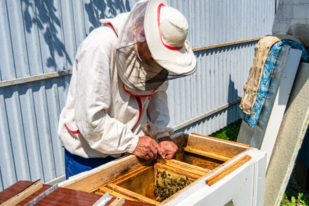 Beekeeper man checking wooden frame before harvesting honey in apiary on sunny day