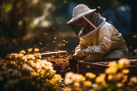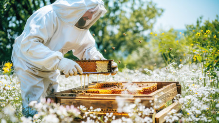 Focused beekeeper gathers honey from hives amidst vibrant apple blossoms on a sunny spring day.