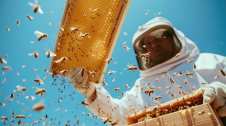 Beekeeper in protective gear inspecting beehive activity. Beekeeper surrounded by bees while working. Concept of apiary maintenance, beekeeping profession, and natural pollination.