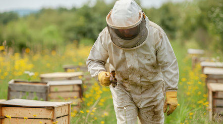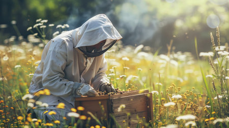 Kneeling beekeeper inspecting hive box in meadow wearing protective suit and gloves, copy space. Apiarist, rural, natural, agriculture, conservation, sustainable