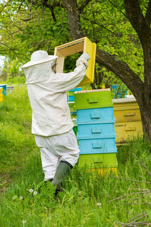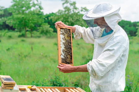 A beekeeper in protective clothing holds a frame with honeycombs, examines bees in the apiary. Preparing for the harvest of honey.
