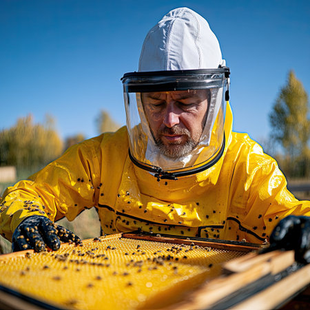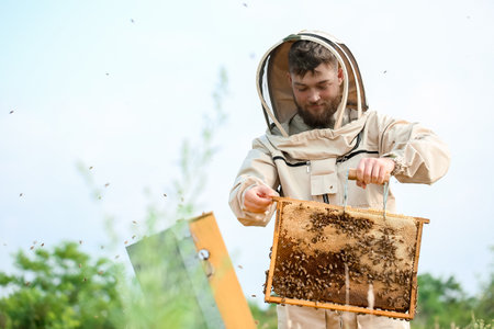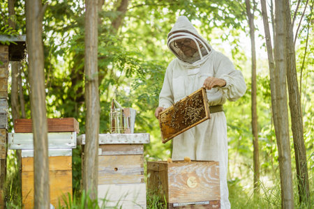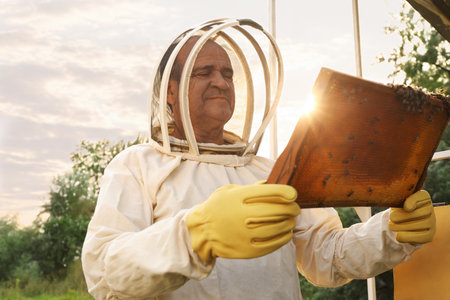 Beekeeper in uniform with honey frame at apiary