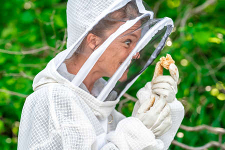 Beekeeping concept, beekeeper looks after bees, the bees checks, checks honey, beekeeper exploring honeycomb