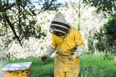 Beekeeper working at his apiary