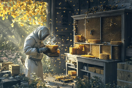 Beekeeper inspects hive health among vibrant autumn foliage and golden honeycomb frames in serene nature setting. Generative AI