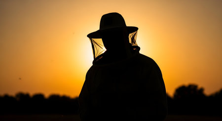 Apiarist in his apiary with bee on hat.