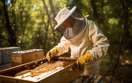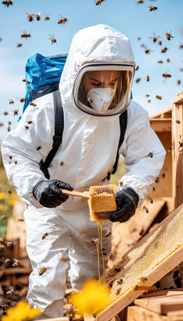 Bee keeper in a uniform standing in apiary and holding a wax.