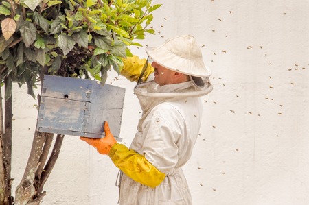 QUITO, ECUADOR, MARCH, 21, 2018: Outdoor view of beekeeper collecting honey on a honeycomb and bees, wearing a a full complete protection against bee sting