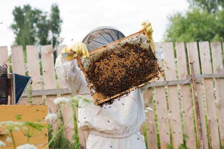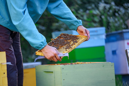 Beekeeper is working on a honeycomb in his apiary.