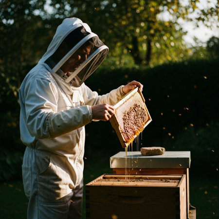 Beekeeper Inspecting Honeycomb Frame with Bees, Honey Production, and Hive Health Check