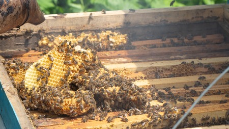 collect honey: honeycomb close-up. Beekeeping works: bees, honeycombs, honey