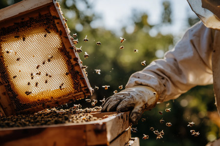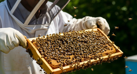 Apiculturist managing honeycomb frames, surrounded by bees. Beekeeper during the honey collection. Concept of bee farming, ecological agriculture, and honey harvest.