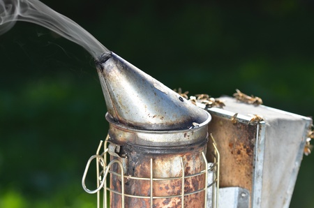 Closeup showing metal beekeeping smoker emitting smoke outdoors, device used by beekeepers for calming honey bees during hive inspection, blurred green background visible