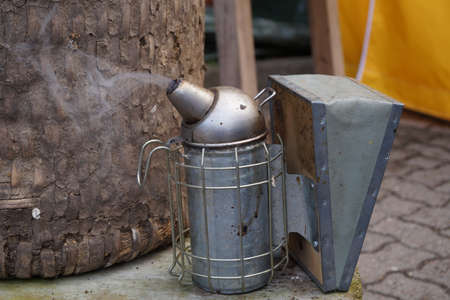 A tool of the beekeeper. Everything for a beekeeper to work with bees. Smoker, a chisel, a box, beekeeper suit for protection from the bees. Beekeeping equipment. Photo on the topic of beekeeping.