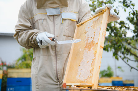 Protected Beekeeper Scraping off Burr-Comb Beewax Honey Cells From the Wooden Hive Frame