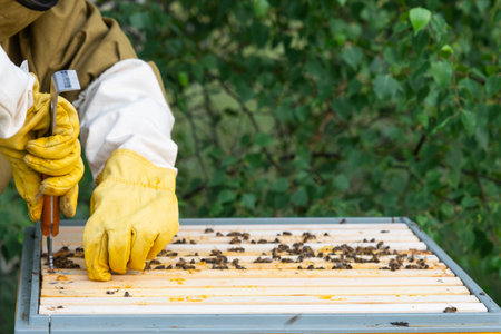 Unrecognizable person pulling out a honeycomb frame with his tool. beekeeping concept