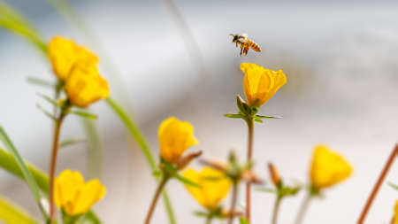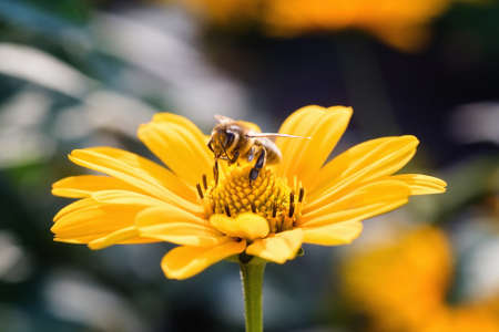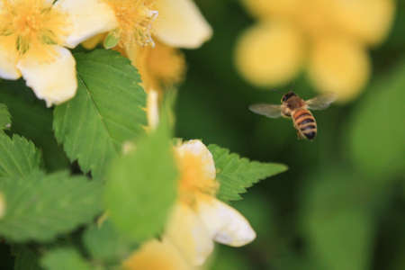 Bee in flight on a flower, honey bee. High resolution photo. Selective focus. Shallow depth of field.