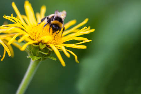 bumblebee pollinates a yellow flower / Closeup. Pollinations of concept