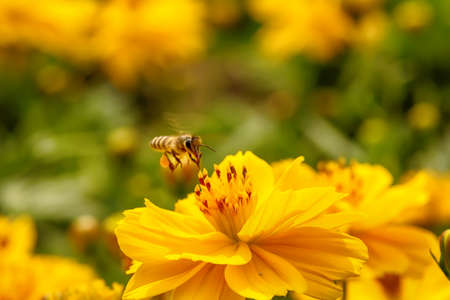 Bee eating pollen from cosmos flower on a nature background.