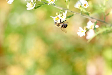 Beautiful honey bee pollinating bright white flower