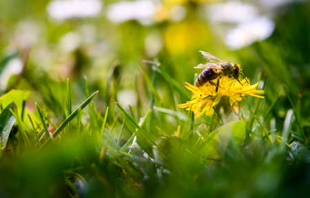 The bee enjoys a sunny day and collects honey on a dandelion flower.
