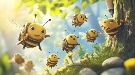 A delightful scene featuring cheerful cartoon bees joyfully flying among vibrant daisies in a sunny nature setting, showcasing the beauty of outdoor life.