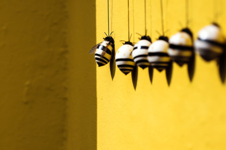 Honey bees hanging on yellow wall, closeup of a bee