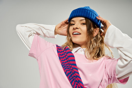 Crazy beautiful trendy girl with cheeky smile in colorful clothes and pink beanie hat. Attractive cool young woman portrait over pastel blue background.