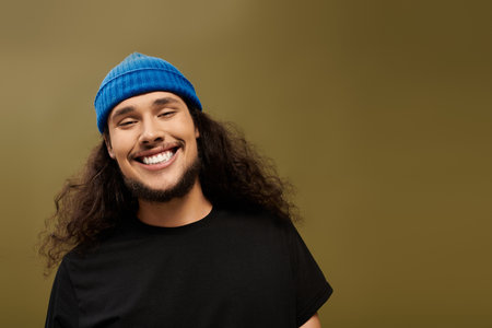 A young man with a beard and curls wears a blue beanie while smiling joyfully.