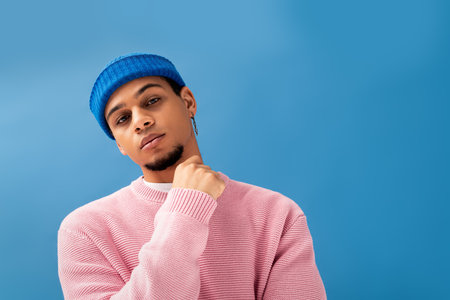 Handsome young man poses confidently in trendy pink sweater and blue hat while contemplating style.