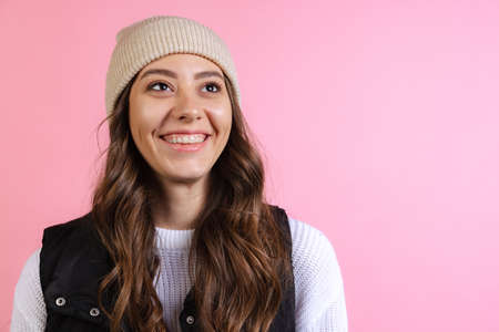 Portrait of stylish smiling young woman wearing an yellow knitted sweater and pink hat on black wall background