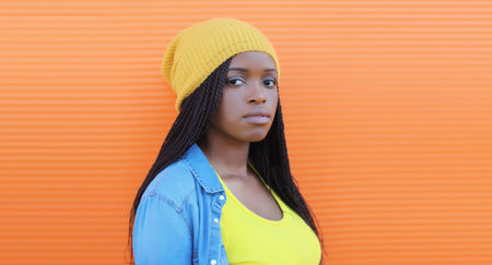 Fashionable portrait of young African woman in casual clothing, stylish modern black girl in yellow hat with dreadlocks posing in the city on bright orange wall background