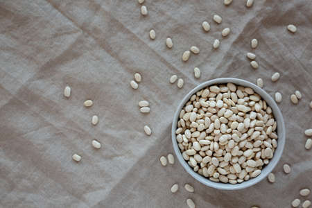 Raw Organic Dry White Beans in a Gray Bowl, top view. Flat lay, overhead, from above. copyspace.