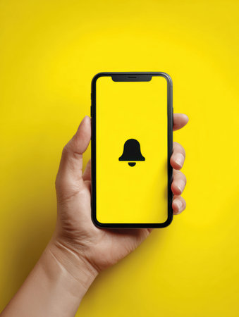 A hand is holding a smartphone that shows a large notification bell icon on a bright yellow screen.