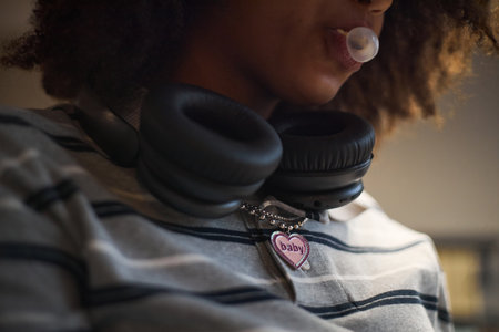 Teenager Black girl blowing bubble gum with over ear headphones around neck and striped shirt visible, wearing heart shaped necklace with baby text, partial face and upper body shown