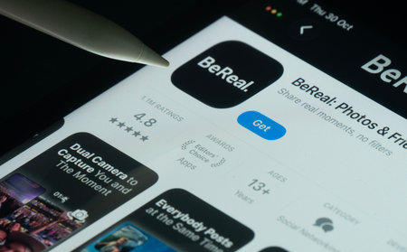 Gdansk Poland - October 2022. Smartphone with BeReal social media app on the screen on iPhone. BeReal is rising in popularity for its Time to BeReal is a French social media app that prompts users to take snapshot and post one unfiltered photo once a day.