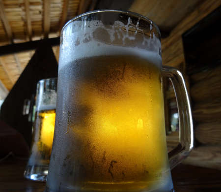 Two beer glasses on the old wooden table at country cottage