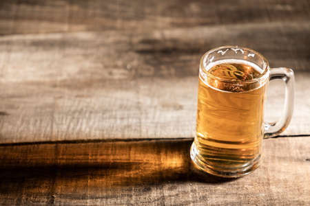 Glass of light beer on wood background