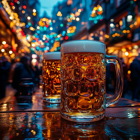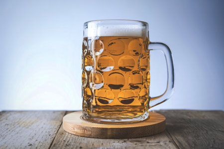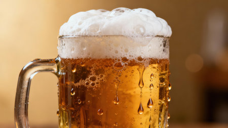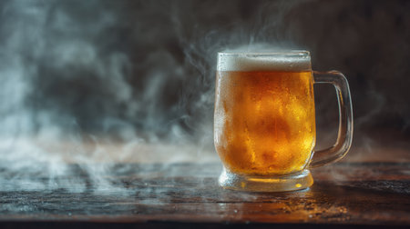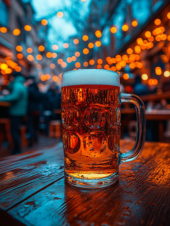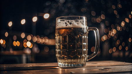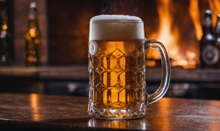 A vibrant glass mug filled with cold beer, topped with foam, rests on a rustic wooden table, enveloped in a warm, cozy atmosphere.