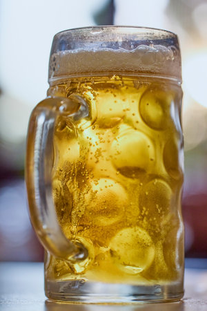 Detailed shot of a beer mug filled with cold, refreshing beer and bubbles.