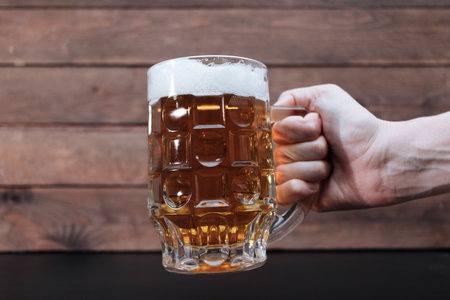 Beer in mug on wooden table with wooden background