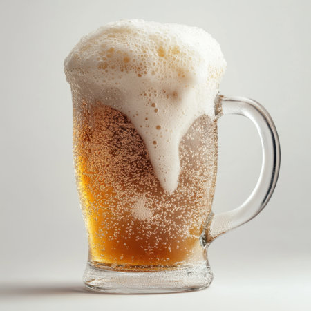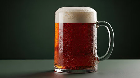 A freshly poured beer displays a rich color and a frothy, bubbly head in a clear glass mug. This image captures the essence of refreshment and social enjoyment.