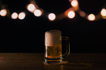 A glass of beer on wooden table that have bokeh lights on top with dark background.