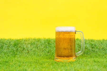 Big mug of beer standing on green grass of artificial lawn with bright yellow background. Copy space. Oktoberfest concept.