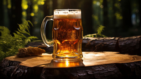 Mug of light beer on a wooden table in the forest.